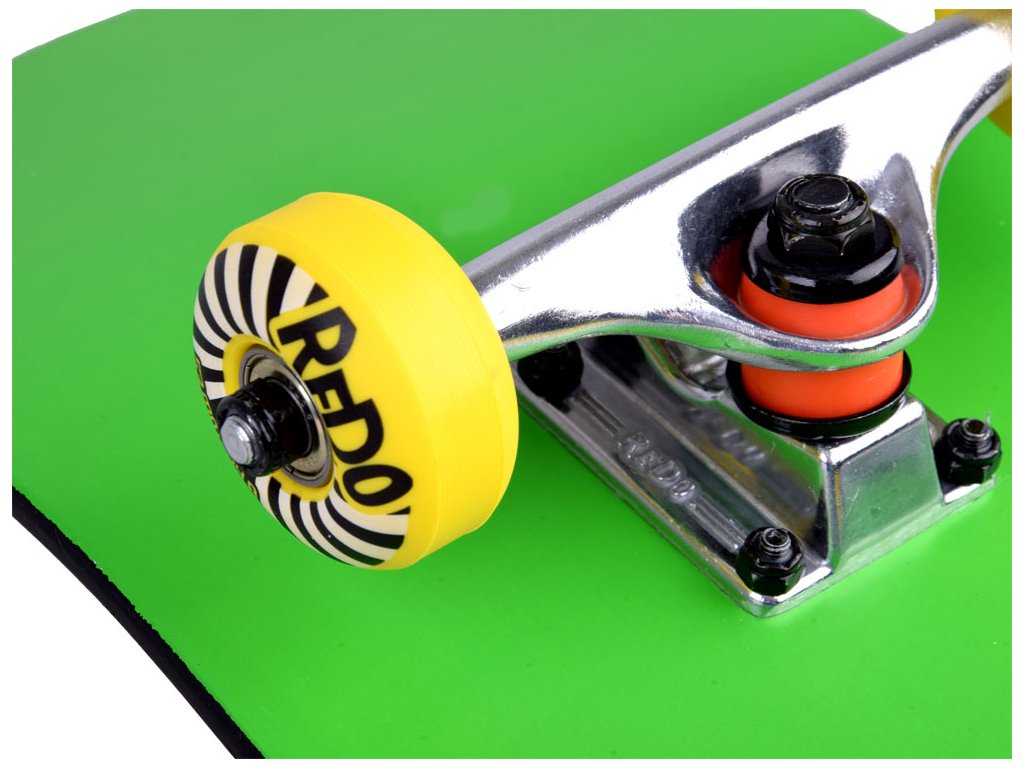 Un skateboard bine lucrat din arțar dur subțire cu 7 straturi, potrivit atât pentru începători, cât și pentru utilizatorii avansați. Formă mai largă pentru un control mai bun al muchiilor, roți netede și axele de viteză pentru o rază de viraj mai mică. Rulmenți în 5 puncte ReDo Abec extrem de rapid, camioane ReDo Geo Lite de 5 inchi cu axă din oțel călit. Roțile din uretan moale de 52MM 95A asigură o călătorie lină. Garnituri netede 86A cu duritate medie pentru rotire mai ușoară și stabilitate.