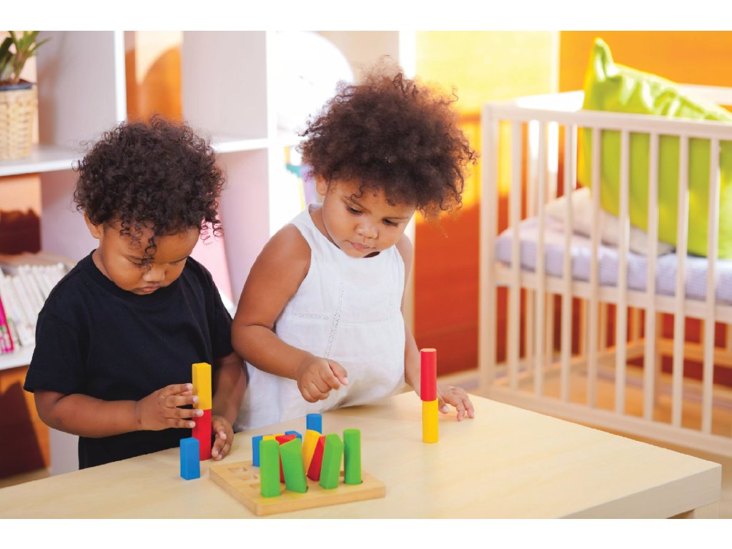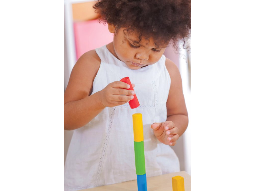 Set de cuburi din lemn conceput pentru copiii mici, care combină distracția cu dezvoltarea abilităților. Jocul sprijină învățarea culorilor, sortarea și motricitatea fină.