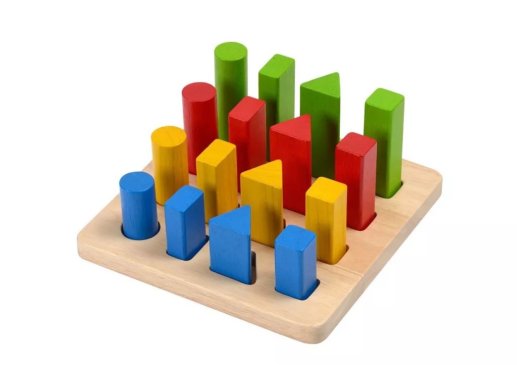 Setul include 16 cuburi geometrice (4 dimensiuni, forme și culori diferite). Cuburile pot fi sortate, numărate sau introduse în baza solidă din lemn.