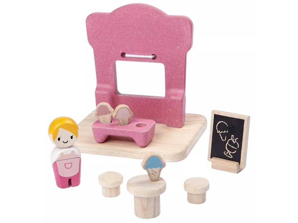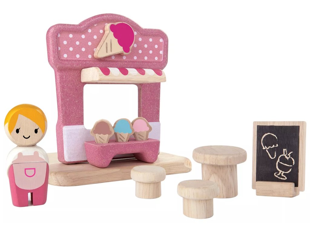 Piesele din lemn demontabile formează un mic stand de înghețată, care poate fi asamblat într-un model compact în câțiva pași simpli. Partea frontală reprezintă fațada standului, piesele din spate reprezintă spațiul interior.