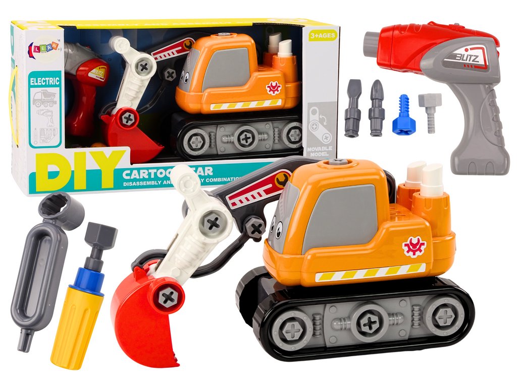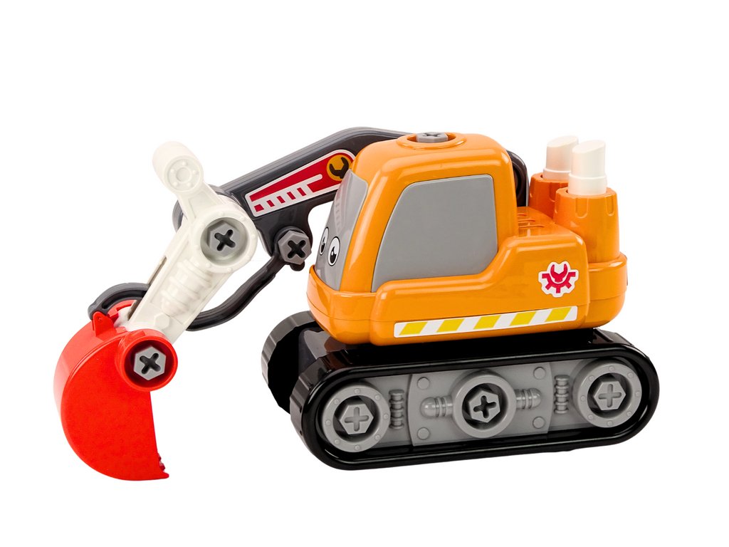 Setul de instrumente inclus - un burghiu, o șurubelniță, o cheie și trei capace de capăt înlocuibile - este o parte integrantă a acestei jucării, care permite copiilor să demonteze și să monteze în mod independent vehiculul. Datorită acestui lucru, copiii nu numai că se distrează, dar învață și cum funcționează excavatorul, își dezvoltă abilitățile manuale, concentrarea și creativitatea.
