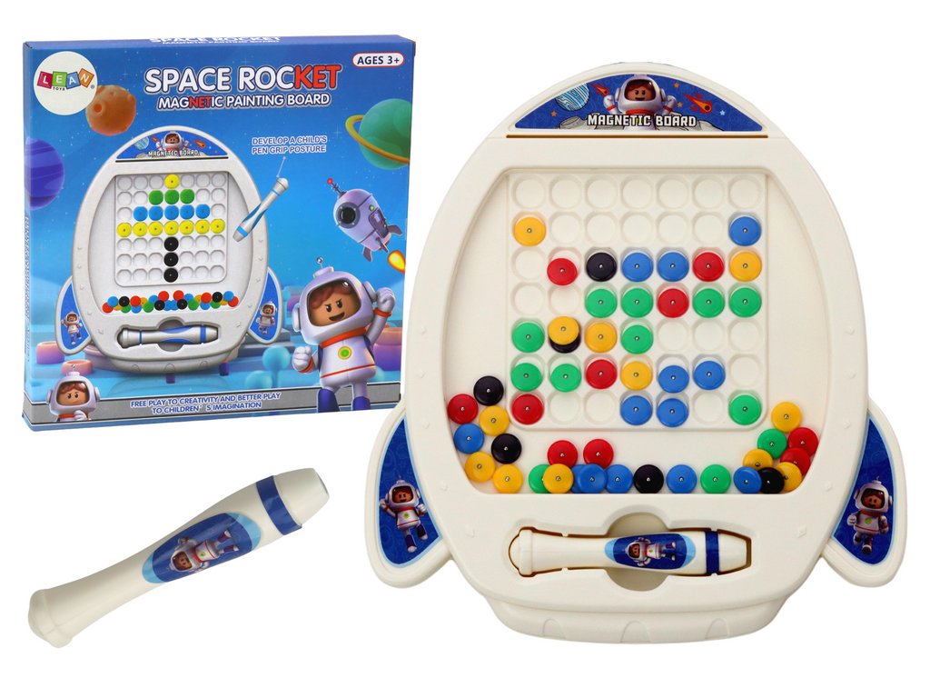 Această tablă magnetică excepțională oferă spațiu nelimitat pentru micii artiști. Setul contine margele colorate in nuante de rosu, galben, verde, albastru si negru care incurajeaza crearea de imagini si modele fantastice. Un stilou magnetic special permite copiilor să manipuleze liber margelele, ceea ce dezvoltă precizia mișcărilor și abilitățile manuale.