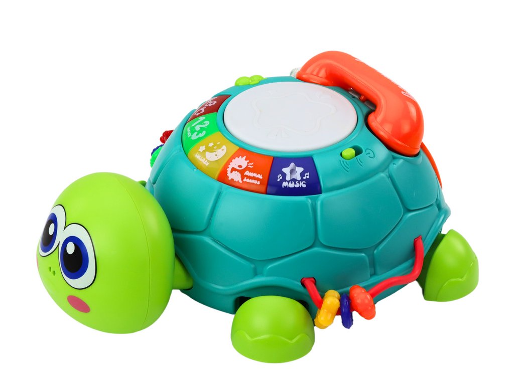 Jucăria are, de asemenea, cinci nasturi amplasați pe carapacea țestoasei. Când le apăsați, țestoasa va rosti numele numerelor, literelor, sunete ale instrumentelor, animalelor și melodiilor vesele. Aceasta este o mare oportunitate de a învăța prin joc, care dezvoltă și abilitățile cognitive și auditive ale copilului.