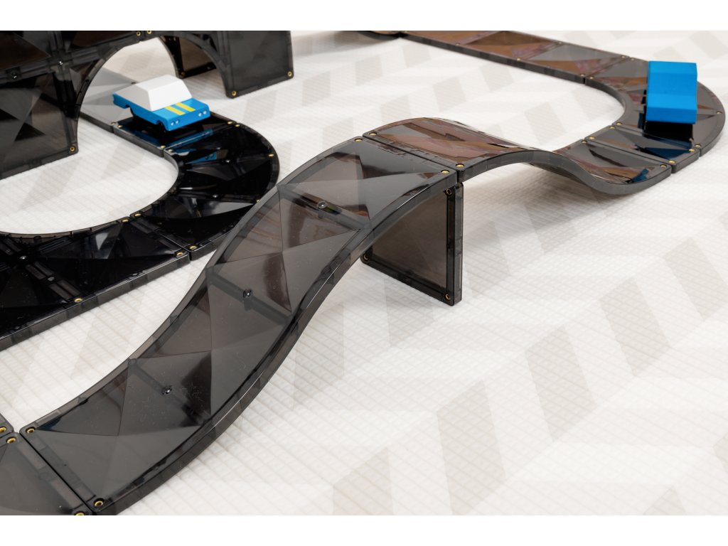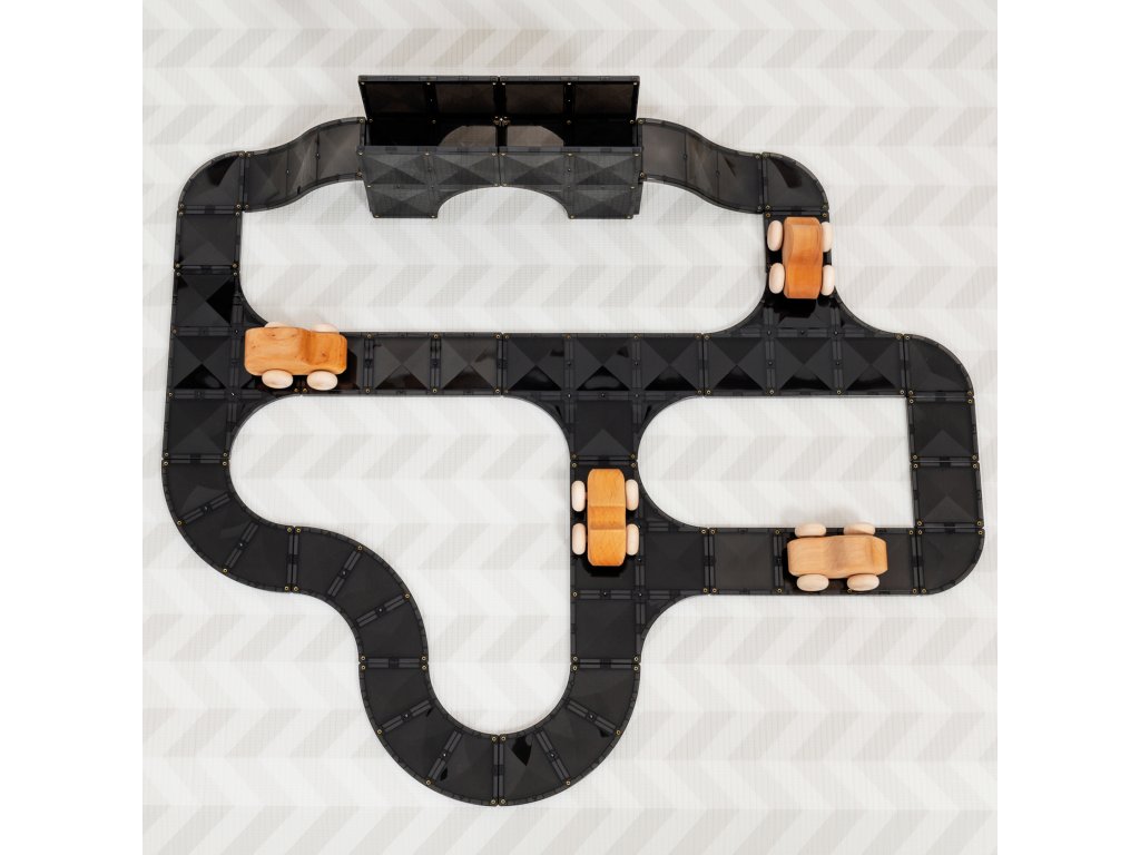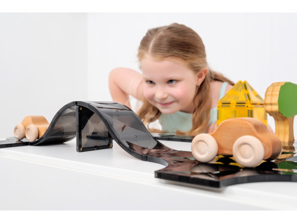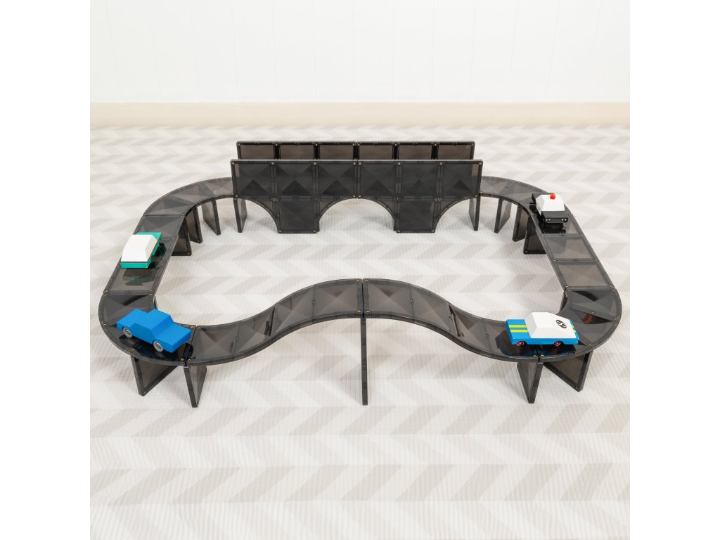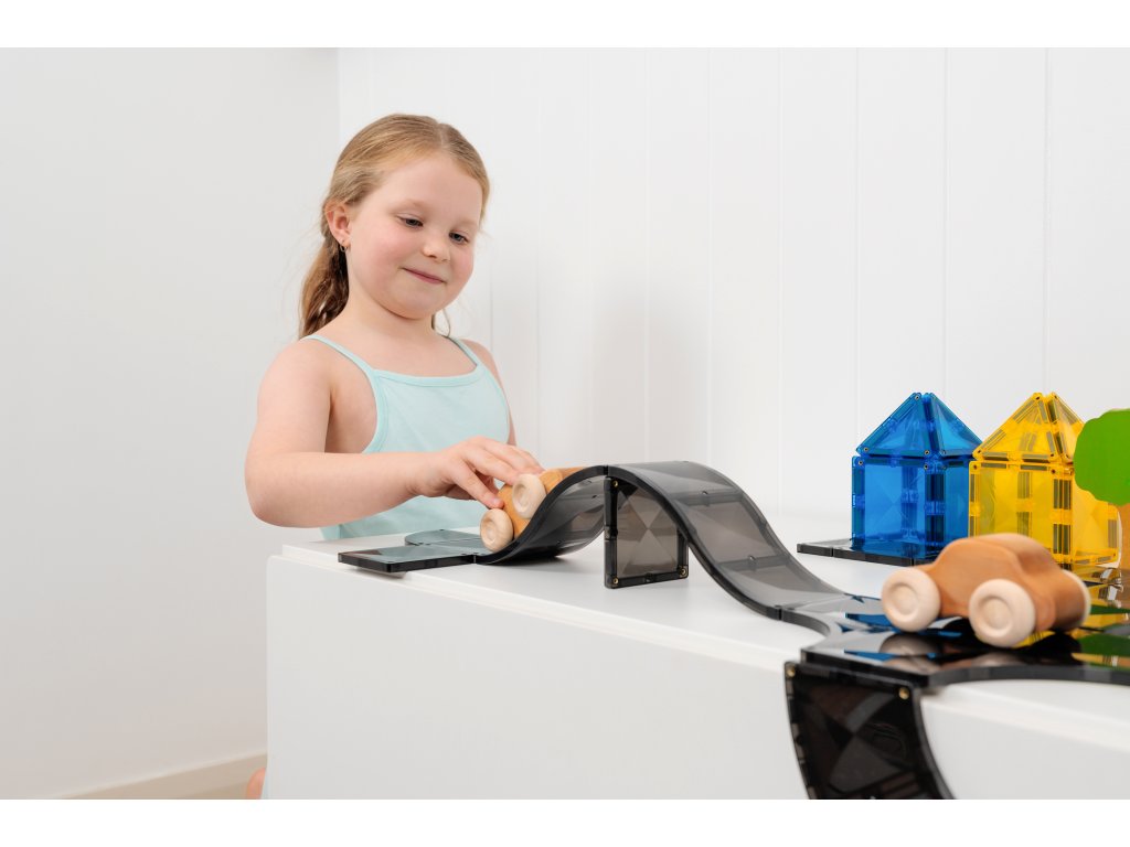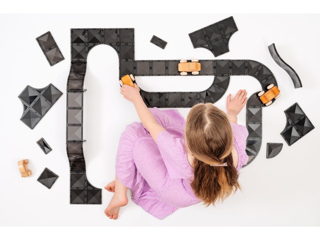 - Posibilități creative : Datorită pieselor unice (rampe, curbe, intersecții), vă puteți crea propriile piste de curse, drumuri, poduri și alte structuri uimitoare.