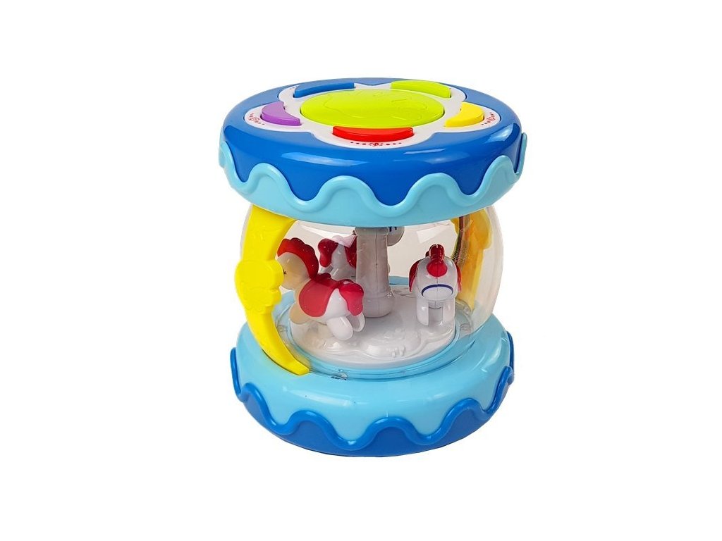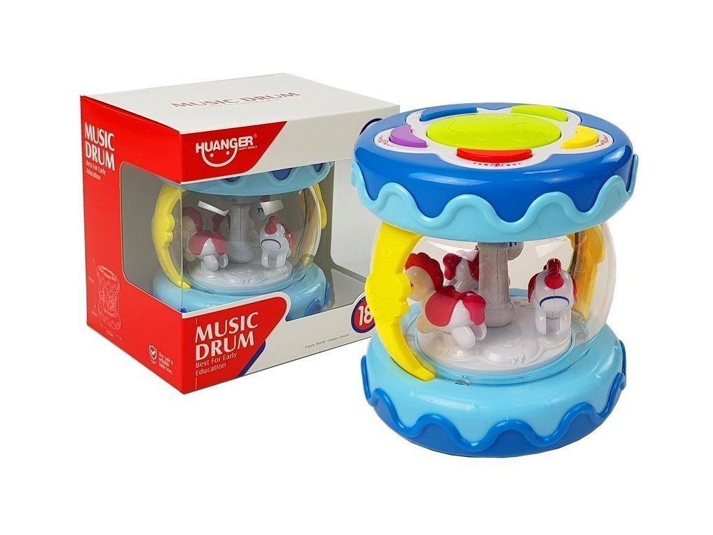 Jucăria are control de volum și efecte de lumină. O alta atractie care atrage atentia copilului este caruselul cu cai in interiorul tobei.