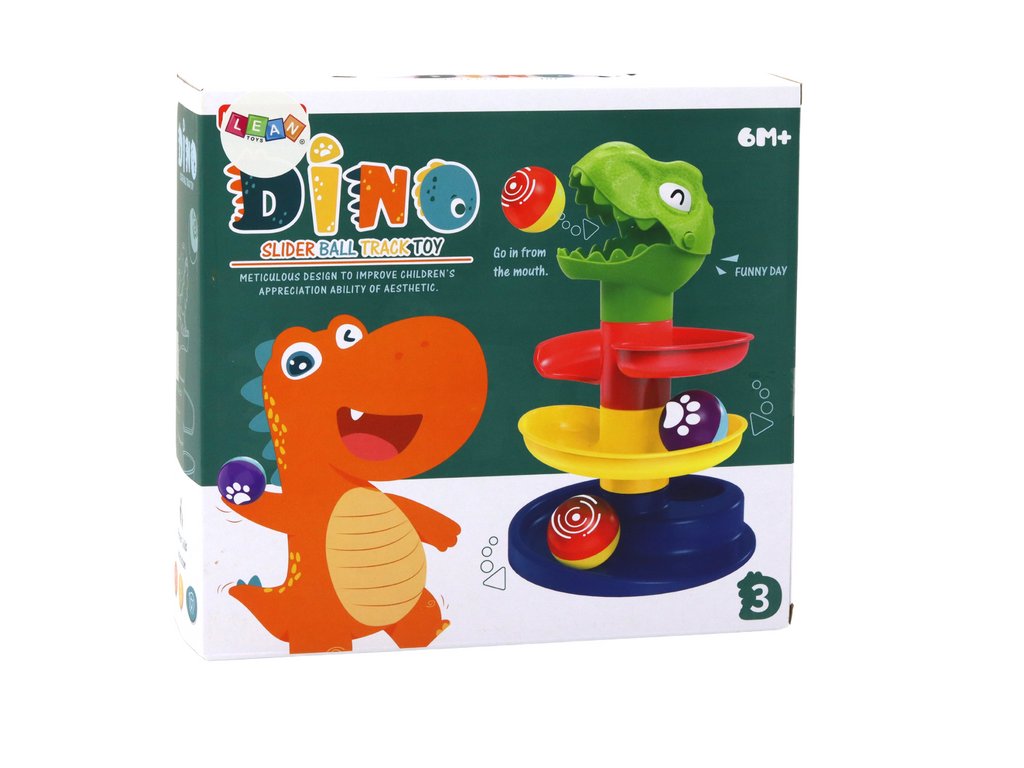Toboganul este format din 4 nivele colorate, elementul de sus fiind un cap de dinozaur verde, care adaugă un element de distracție și fantezie. În timpul jocului, copilul antrenează coordonarea, precizia și abilitățile manuale, pune mingea în gura dinozaurului și urmărește mișcarea liberă a acestuia prin etajele individuale până la coborârea la nivelurile inferioare.