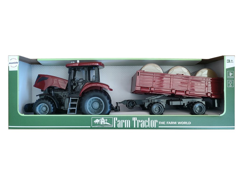 Remorca este echipată cu trei baloți rotunzi de fân, care pot fi încărcați și descărcați. Tractorul în sine are un design detaliat, cu roți robuste și butoane de control pe capotă. Copiii se pot juca scene de fermă pline de recoltare, transport de fân sau muncă pe câmp. Jucăria susține jocul creativ, dezvoltarea imaginației și motricității.