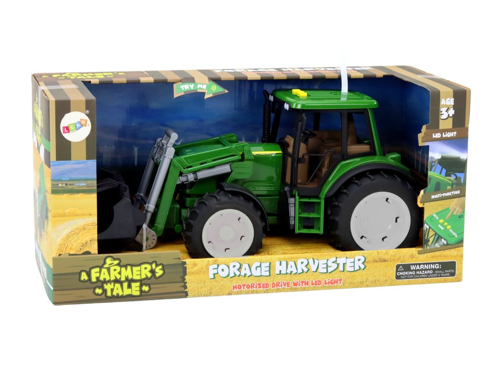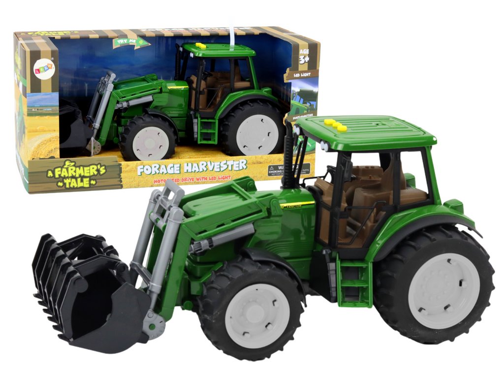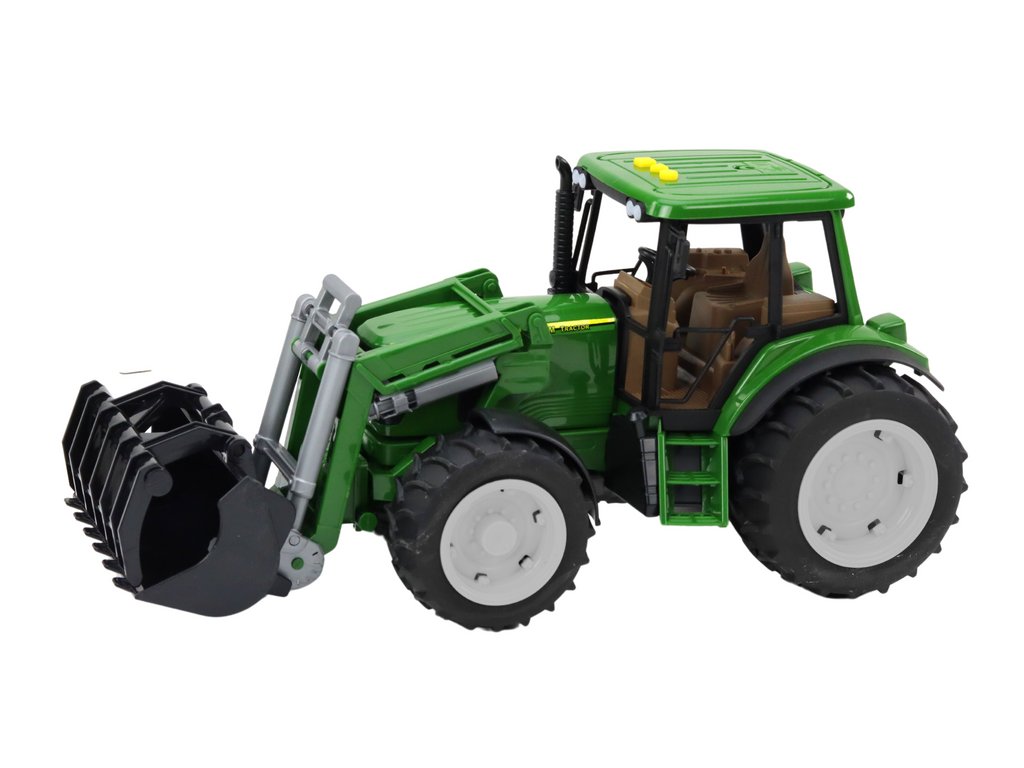 Tractor de fermă mare, verde, cu excavator, lumini și sunete
