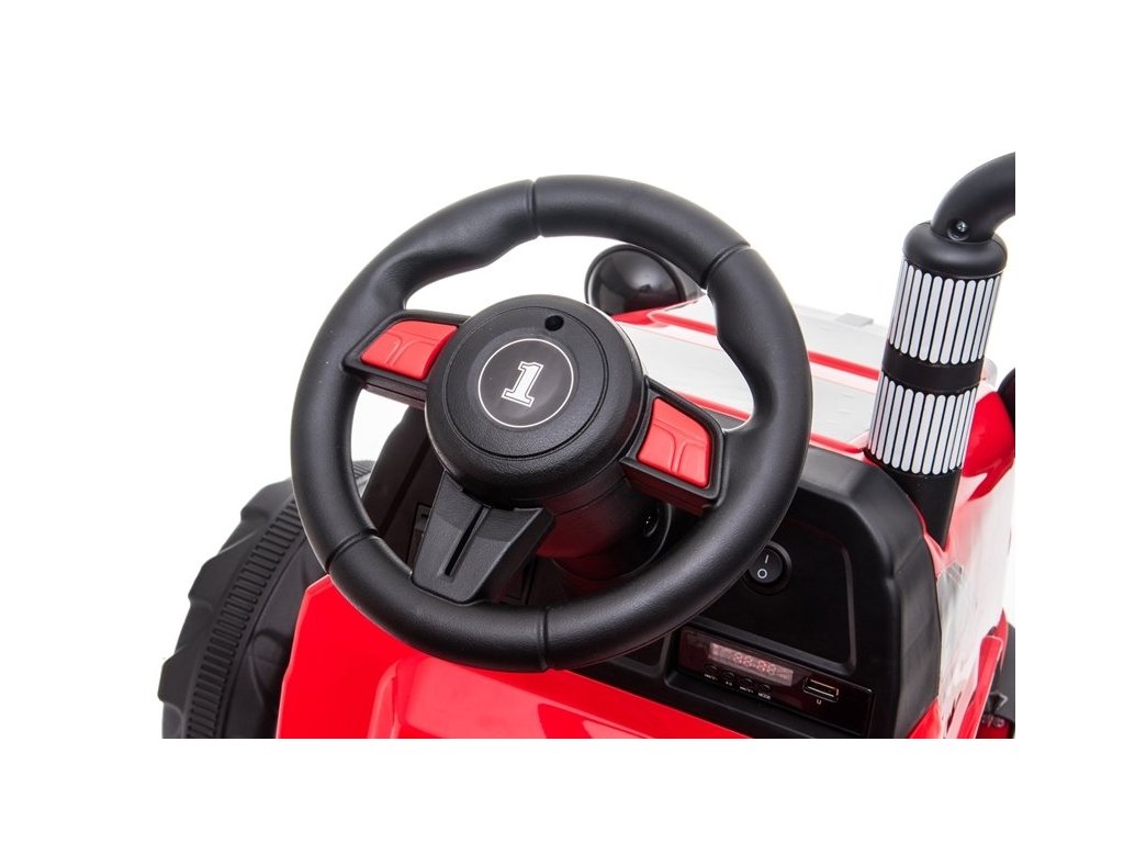 Tractorul pentru copii cu remorcă arată grozav - suntem siguri că șoferii tineri se vor simți la fel. În interior se află un scaun negru, vizavi este un volan rotativ, butoane de control și un panou muzical cu intrare USB și Bluetooth. Pentru a porni vehiculul, trebuie doar să apăsați butonul START și să selectați viteza folosind comutatorul.
