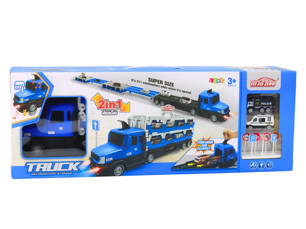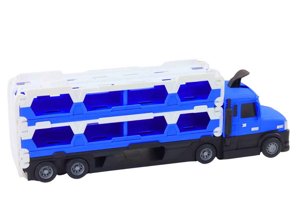 Vă prezentăm o jucărie inovatoare care combină funcția unui camion de trafic și a unei piste de curse într-o singură culoare - într-o culoare albastră dinamică. Această jucărie versatilă oferă ore de distracție captivantă, deoarece vă permite să transportați mașini de jucărie și să organizați curse interesante.
