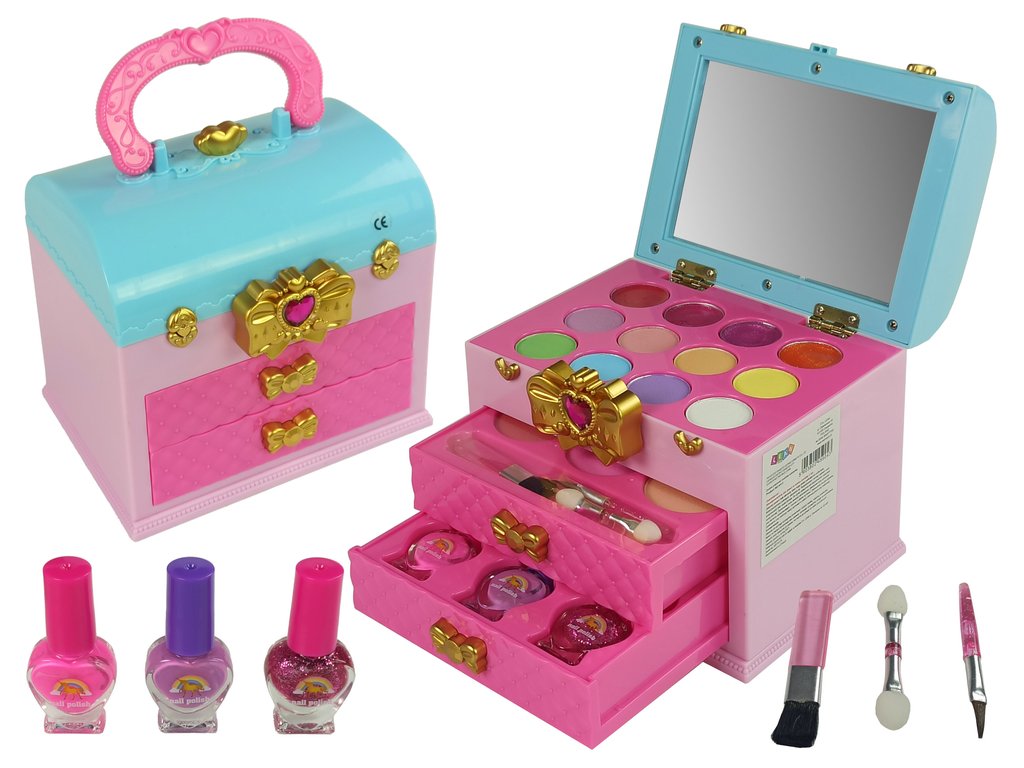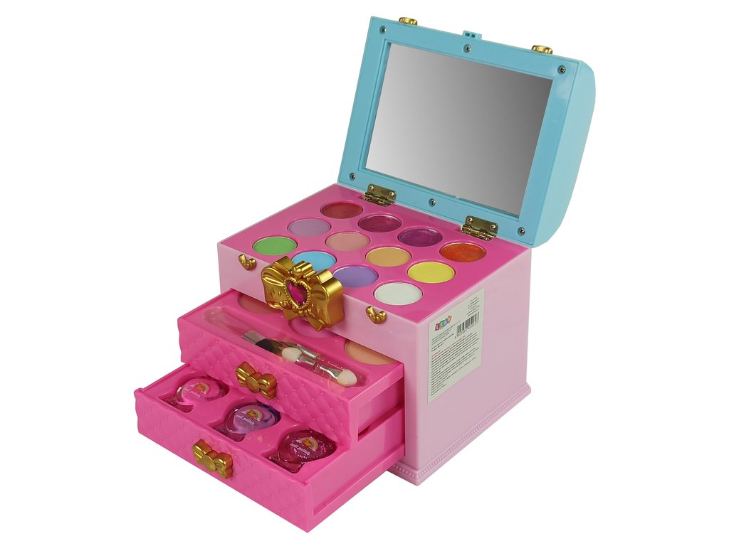 Întregul set este depozitat într-o cutie frumoasă închisă cu o cataramă cu fundă și o inimă de diamant . Servieta în sine este realizată foarte elegant și interesant. Culorile roz si albastru deschis sunt potrivite pentru orice interior, in special pentru o camera de copii. Sertarele sunt extensibile si au un maner in forma de fundita aurie. După deschiderea carcasei, fetița va fi încântată de selecția de culori de fard de ochi și luciu de buze. Există o oglindă pe capac, astfel încât să poți lua cu ușurință cartuşul cu tine și să te pictezi oriunde.