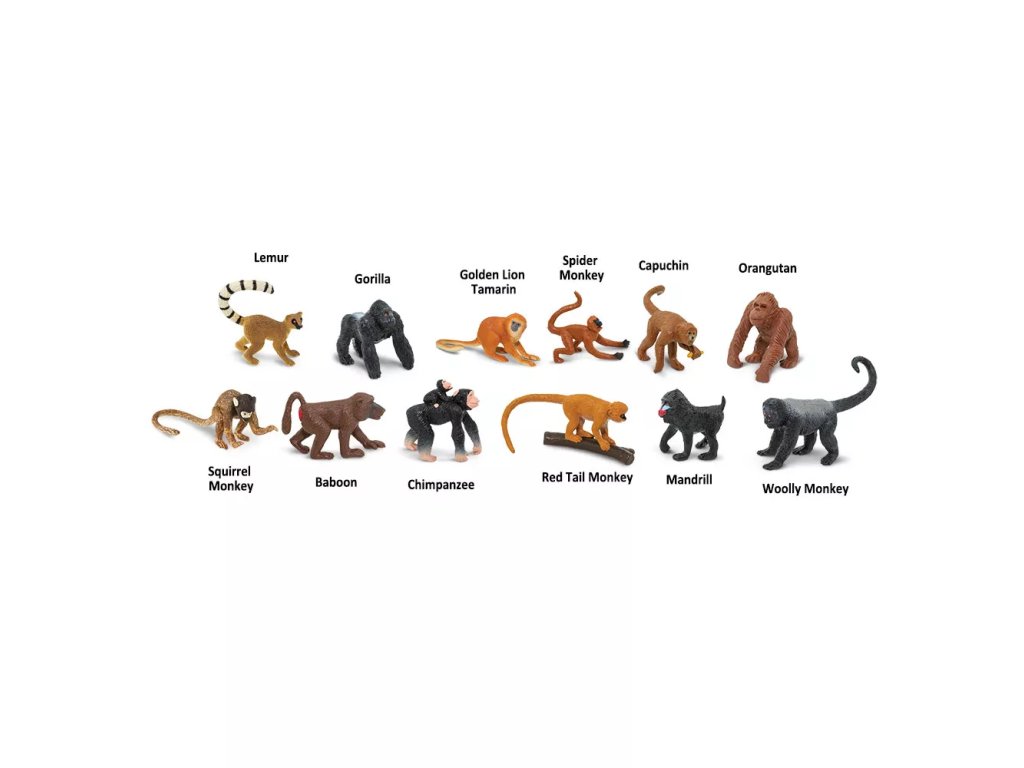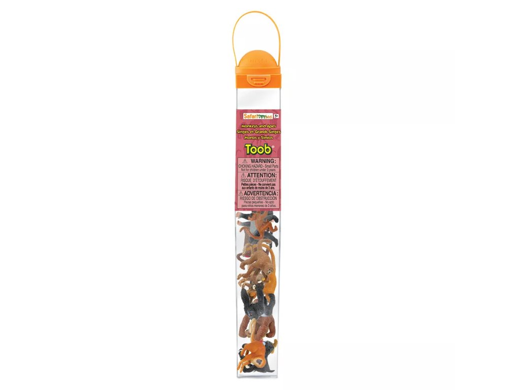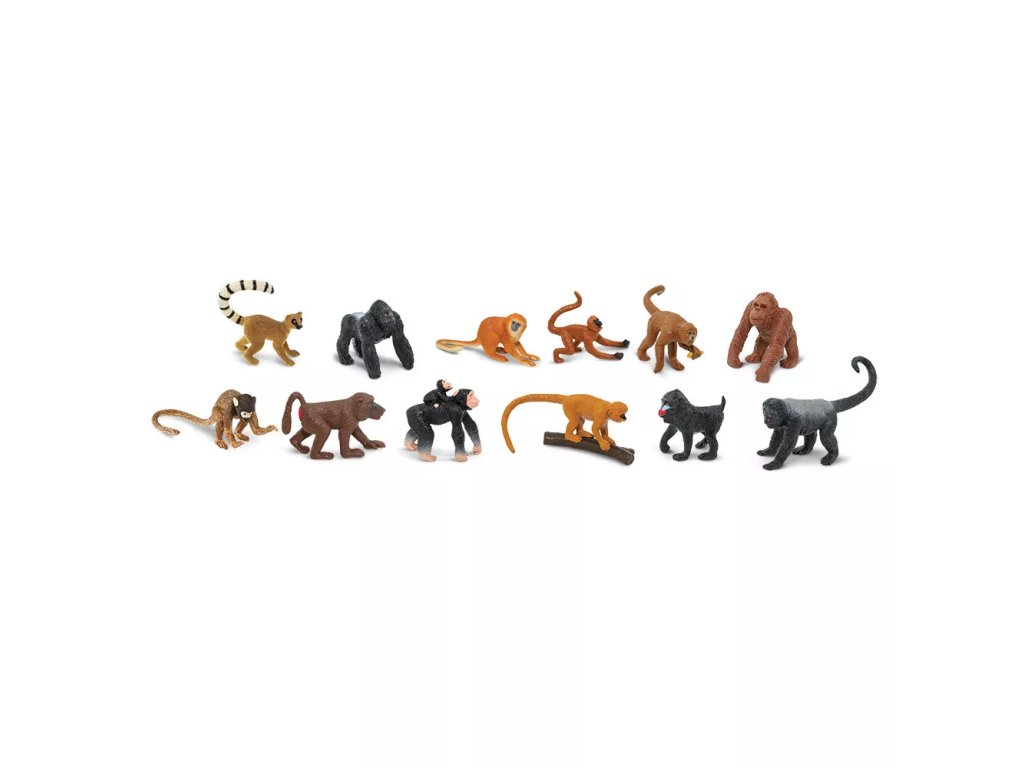 Tubă care conține 12 figurine cu primate, prelucrate realist, de dimensiuni 4–7,5 cm.
