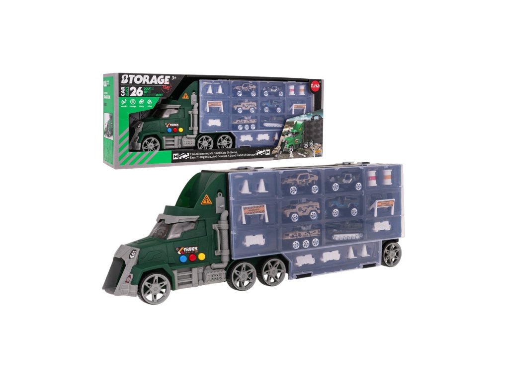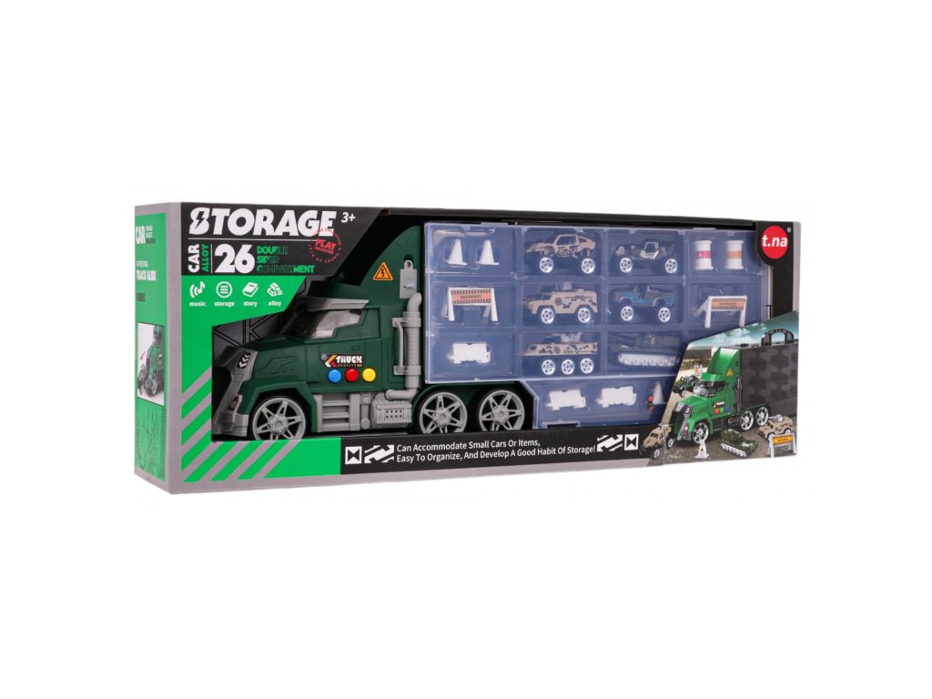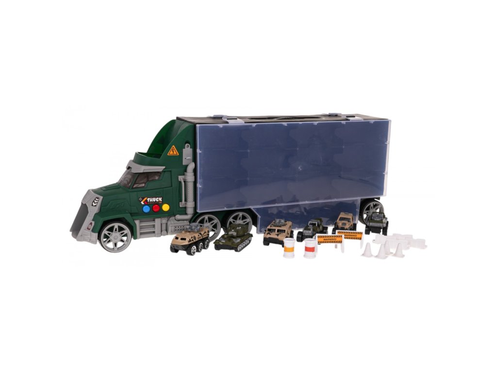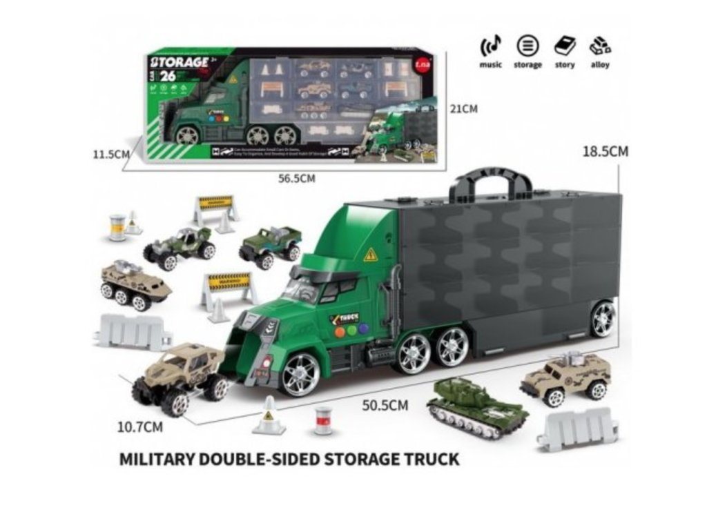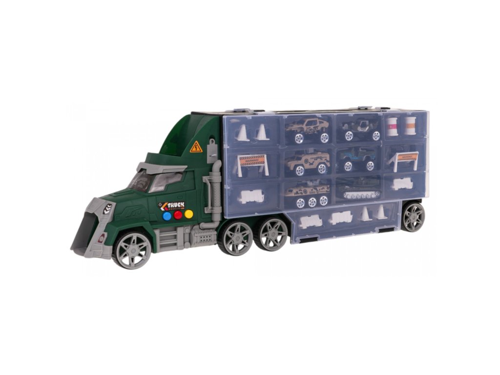 Set militar interactiv, camion militar cu efecte sonore și luminoase și accesorii pentru copii de la 3 ani . Camionul are multe secrete de descoperit. Pe lateralele remorcii există compartimente cu deschidere pentru accesoriile care fac parte din set. Pe acoperișul cabinei există un tobogan pentru mașinile militare. Mașina de jucărie este introdusă în acoperișul cabinei și iese pe partea din față a vehiculului.