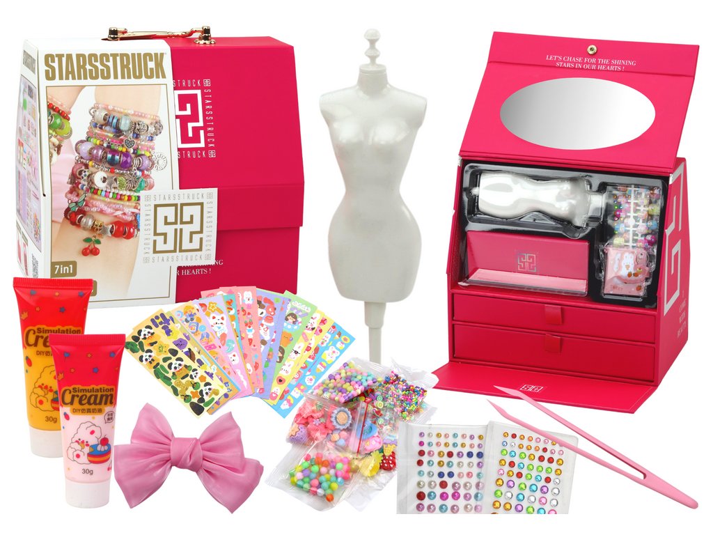 Setul conține o selecție bogată de materiale care stimulează imaginația și încurajează experimentarea. De la țesături și șireturi până la diverse accesorii, fiecare element permite crearea unui stil unic și frumos.