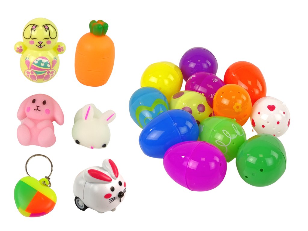 Setul contine 12 oua de plastic in culori diferite, dar in interior sunt goale si usor de deschis. Ele pot fi un decor frumos sau o formă de joacă. Înăuntru puteți ascunde mici jucării fidget - sunt doar 6, lăsați-le pe celelalte goale. Puteți începe un joc de căutare, câștigă cine găsește cele mai multe jucării.
