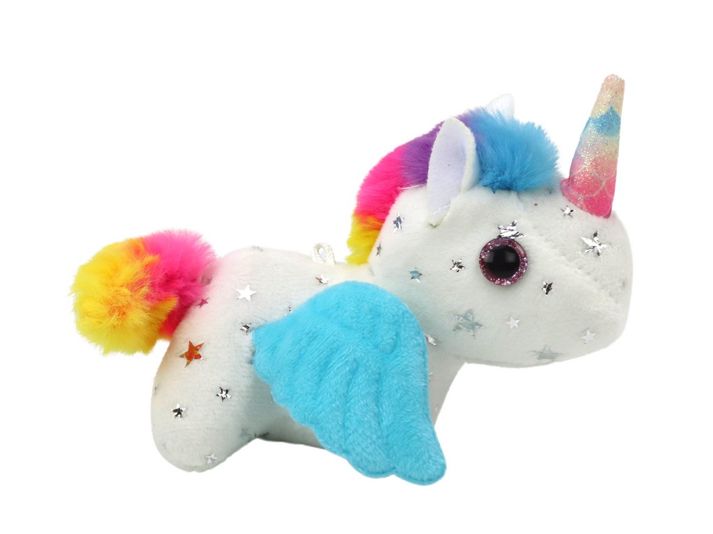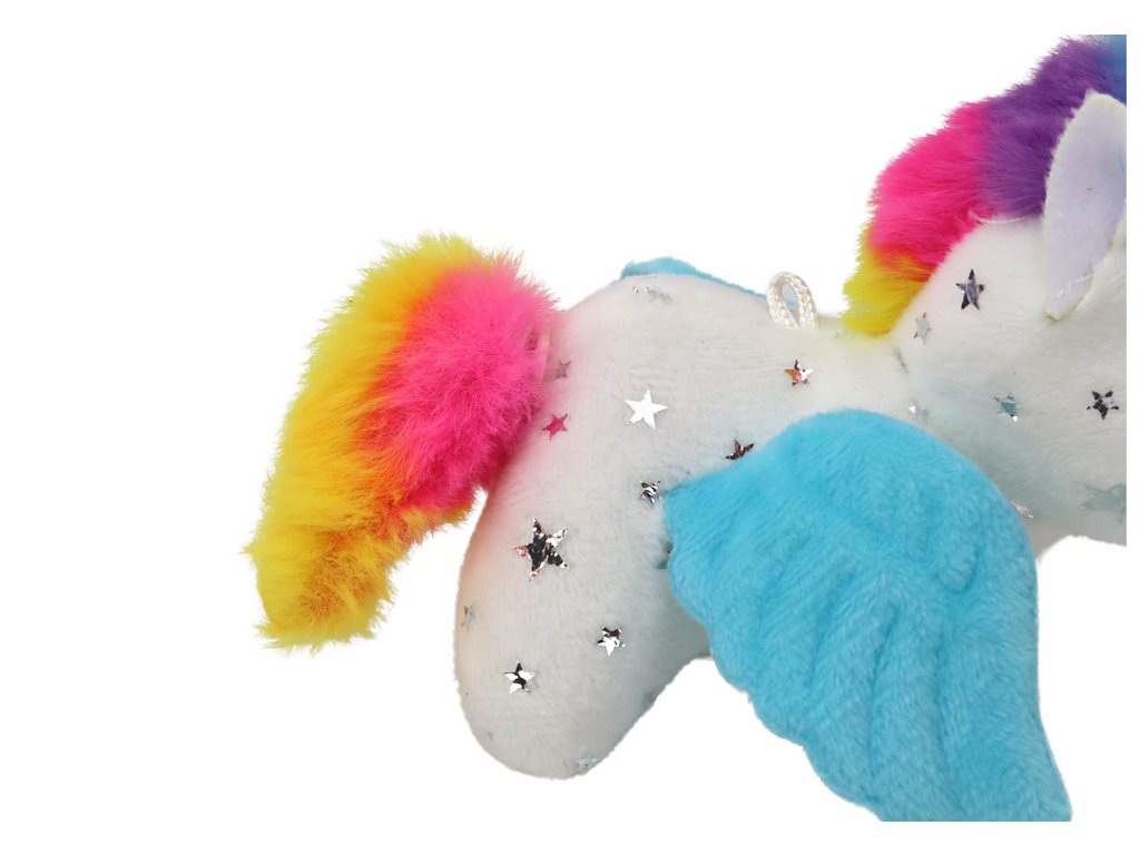 Amintește de un cal adevărat din lumea magiei, unicornul nostru de pluș are și frumoase aripi albastre care îi adaugă și mai multă magie și fantezie. Dar asta nu este tot! Datorită șnurului întins, calul va sări bucuros și va da din coadă, ceea ce face jocul și mai incitant și plin de zâmbete.