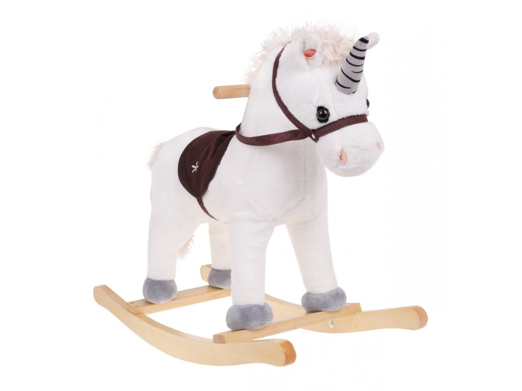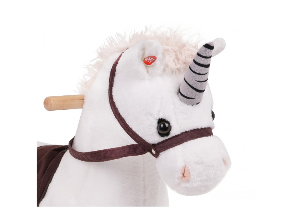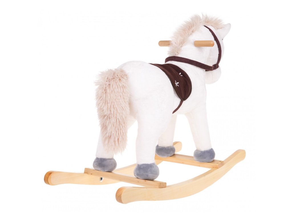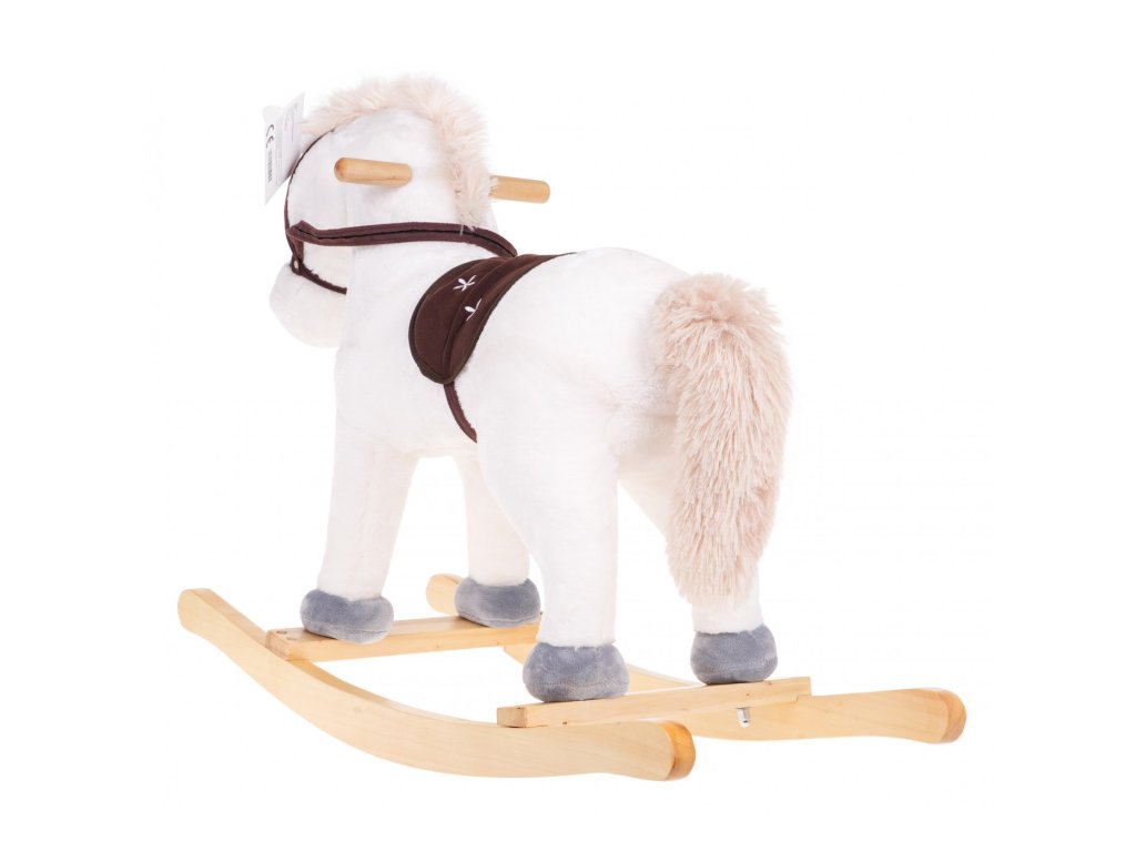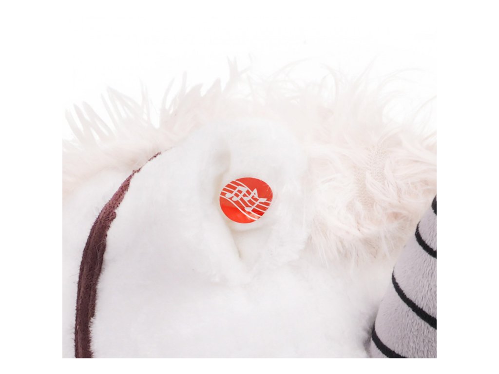 Un cal balansoar frumos pentru copii de la 24 de luni . Este confectionata din material foarte placut la atingere. Există o eșarfă detașabilă în jurul gâtului calului. Are un scaun confortabil, șine și mânere din lemn sigure. Există senzori la urechea dreaptă și stângă a calului care declanșează sunetul nechezatului și al galopului.