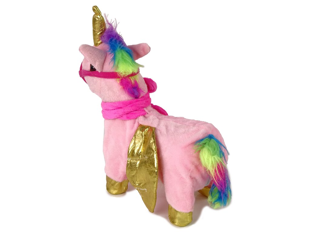 Unicornul interactiv este realizat cu cea mai mare grijă, are o culoare roz, aripi aurii și o coamă colorată și este moale la atingere. Inorogul toarcă și cântă o melodie country. După ce ați introdus bateriile, trebuie doar să apăsați mânerul lesei și unicornul merge, își mișcă coada și capul.