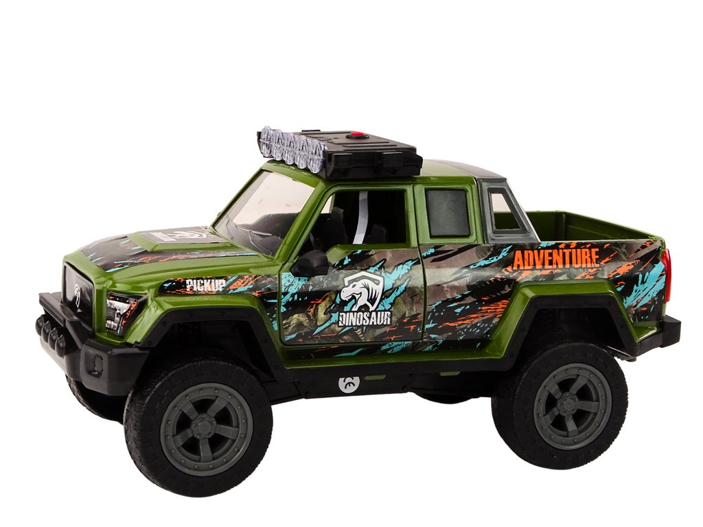 Vânătorul de dinozauri off-road este o jucărie grozavă pentru tinerii aventurieri și pasionații de dinozauri. Mașina este într-o culoare verde elegantă, cu marcaje realiste de vânătoare care atrag imediat atenția prin aspectul lor autentic. Pe plafonul vehiculului există lumini funcționale care se aprind atunci când este apăsat un buton, iar mașina emite sunete realiste ale motorului, aducând un plus de realism distracției.