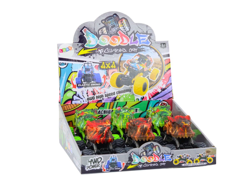 Această jucărie unică combină două categorii fascinante: mașini și dinozauri. Mașina are forma unui dinozaur, ceea ce îi conferă un aspect unic și distractiv, combinând lumea dinozaurilor cu un vehicul de teren. Este echipat cu un drive, ceea ce înseamnă că se poate deplasa înainte sau înapoi, oferind distracție dinamică. Roțile mașinii sunt montate pe arcuri, permițându-i să sară și să se ridice, adăugând elemente de acțiune jocului.